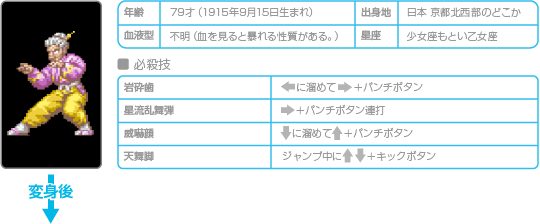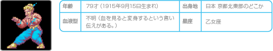 不屈の精神で生き抜いてきたため、人間離れしている。内に何を秘めているのか計り知れないものがある。 ![]() ![]() |