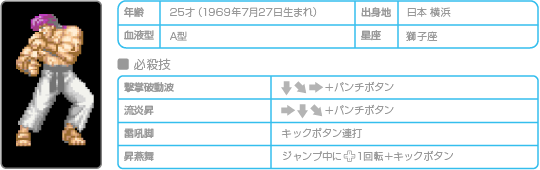 自己陶酔型。母を知らずに育ったせいか子供の頃は乱暴者だった。一時期不良化し友人の一人がリーダーになっているグループに入りかけたが、父の熱い愛情により更正する。(いまでもその友人とはつきあっているらしい) ![]() |