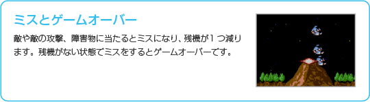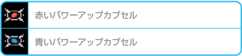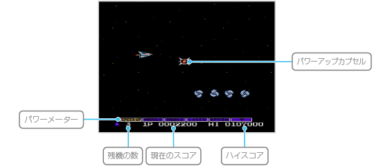 特定の敵や編隊を倒すとパワーアップカプセルが現れます。赤いパワーアップカプセルは自機のパワーアップに使い、青いパワーアップカプセルは画面内の弱い敵を消し去る効果があります。