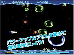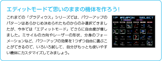 「グラディウス」シリーズの大きな魅力の1つが、自分の好きなタイミングで思いどおりに機体を強化できるパワーアップシステム。『グラディウスIII』では、パワーアップの種類が前作よりもさらに多彩になっています。 自分のお気に入りのウェポンで充分に自機を強化して、敵に立ち向かいましょう。 |