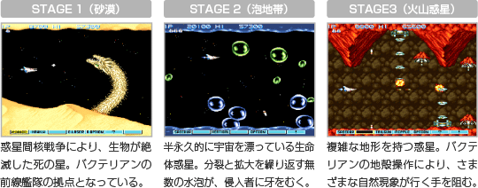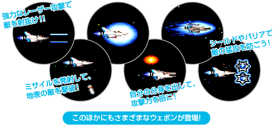ゲームの舞台は砂漠や火山など、多彩な特徴を持つ惑星です。次々に襲ってくる敵だけではなく、クセのある地形も厄介な障害の1つ。油断せずに進みましょう。なお、どこかのステージには、隠された道があるというウワサも……? ![]() |