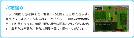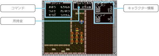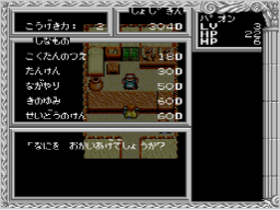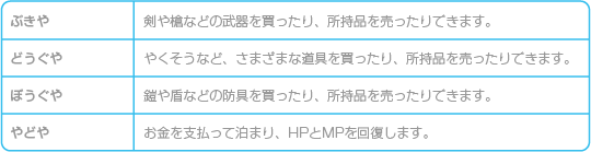 街にはさまざまな施設があります。 店でアイテムを買うときは「どうぐ(「ぶき」または「ぼうぐ」)をかう」を選び、続いてほしいアイテムを選んでください。売るときは「もちものをうる」を選び、続いて所持品から売る物を選びましょう。 |