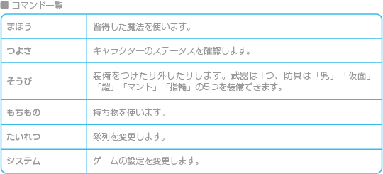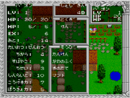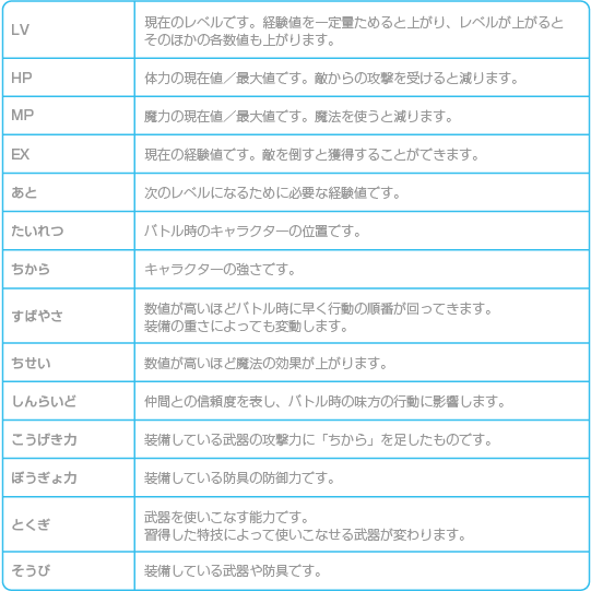 コマンドの「つよさ」を選び、続いてキャラクターを選ぶと、詳しいステータス(キャラクターの能力)が表示されます。 この画面で |