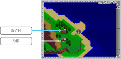 街や村、神殿などにたどり着くと中に入ることができ、さまざまな施設を利用できます。 |