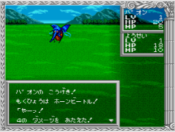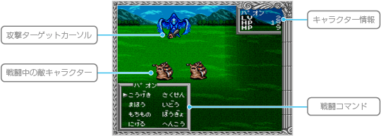 物理攻撃や魔法で敵を攻撃し、倒してください。敵を倒すと経験値が手に入り、一定量たまるとレベルが上がります。 敵の攻撃によってHPが「0」より低くなると気絶します。パーティ全員が気絶すると最後にセーブした場所に戻され、所持金が半分になってしまうので注意してください。 |