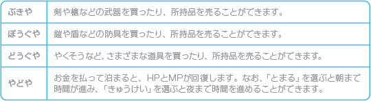 街にはさまざまな施設があります。店主に話しかけて利用しましょう。 ![]() |