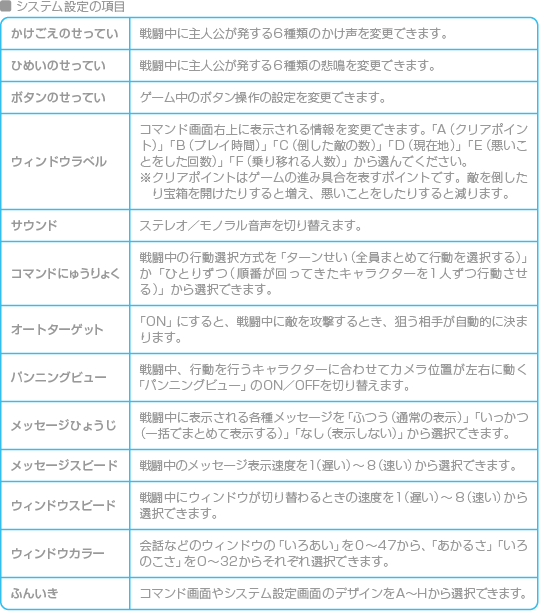 ※「かけごえのせってい」「ひめいのせってい」「ボタンのせってい」では、「せってい1」や「せってい2」を選んで
