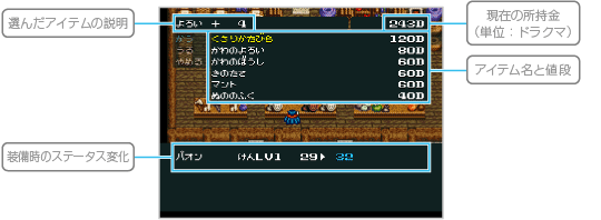 店でアイテムを買うときは「かう」を選び、続いてほしいアイテムを選んでください。 売るときは「うる」を選んで所持品から売る物を選びましょう。 ![]() |