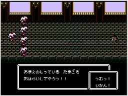 マップ内には、モンスターの城が4つあります。これらの城に攻め込んで戦闘に勝つと、それ以降城を訪ねるたびに「おはらい」をしてもらうことができ、将軍が持っている卵にそのモンスターのパワーを入れることができます。 |