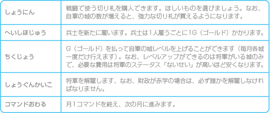 月1イベントが終わると、続いて月1コマンドが表示され、切り札の購入や兵士の補充などを行うことができます。準備ができたら「コマンドおわる」を選んで次の月へ進みましょう。