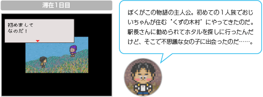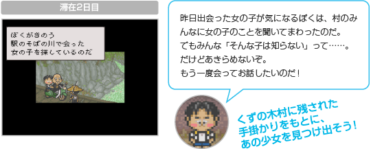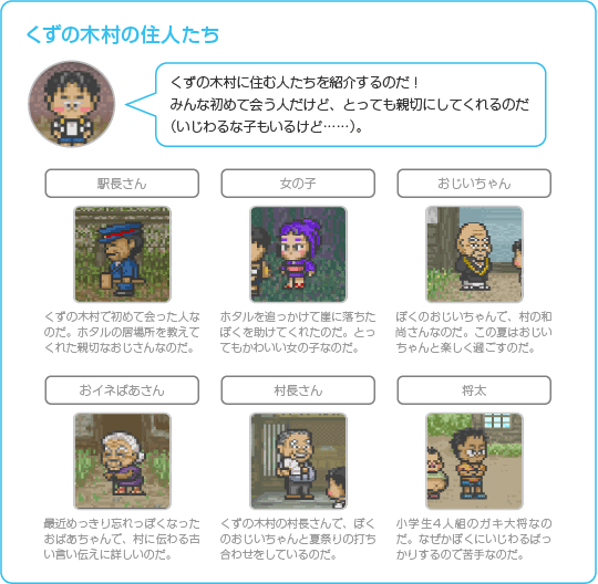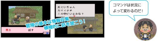 冒険の進めかたはとってもかんたん。「歩く」「話す」などのコマンドを選ぶだけです。コマンドによってはどこに行くかや話しかける相手、話題なども選べます。おじいちゃんや村人たちの話をよく聞いて、いろんな場所で情報を集めましょう。 ![]() |
