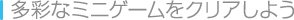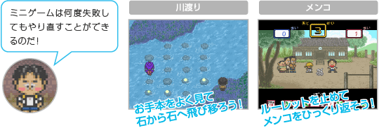 冒険の途中で登場するミニゲームは、川渡りや魚とり、懐かしのメンコなど種類が豊富。そしてミニゲームのどれもが冒険を進めるうえで重要な役割を持っているので、気を引き締めてとりかかろう。 ![]() |