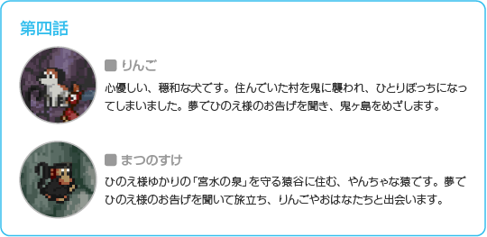 このゲームをクリアすると、1987年にディスクシステム用ソフトとして発売された『ふぁみこんむかし話 新・鬼ヶ島 後編』も遊べるようになります。これは男の子と女の子が犬、猿、キジの3匹を連れて鬼退治をするという、昔話「桃太郎」を題材にしたお話です。おはなやりんご、まつのすけも仲間として登場します。 |