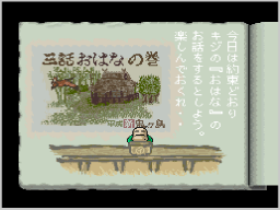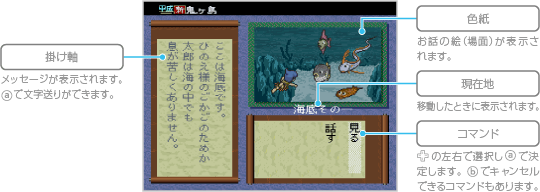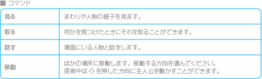 いったいさんのお話が終わると冒険開始です。さまざまなコマンドを選んで主人公の行動を決め、お話を進めてください。 ![]() ![]() ※このほかにも、場面によってさまざまなコマンドが表示されます。 |