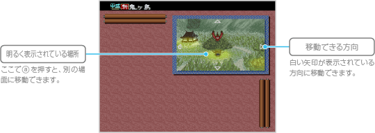 上空など一部の場面では、主人公を動かして場面内を自由に移動できます。場面に白い矢印が表示されたら、 ![]() |