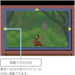 場面によっては、上下や左右の方向にある別の場所に移動できます。場面に黄色い矢印が表示されたら、 |