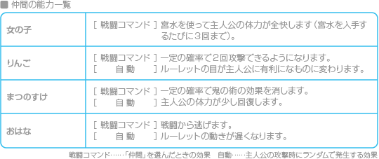 表示されている戦闘コマンドを選んでください。「攻撃」を選ぶと鬼を攻撃し、攻撃の結果はルーレットで決まります。ルーレットには「命中」や「はずれ」などの目が表示されるので、 「仲間」を選ぶと仲間の能力を使うことができます。 「体力」を選ぶと主人公と鬼の体力の現在値と最大値を表示します。なお、主人公が攻撃を開始したときに、りんご、まつのすけ、おはなのいずれかが自動的に援護をしてくれることもあります。 |