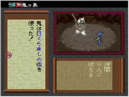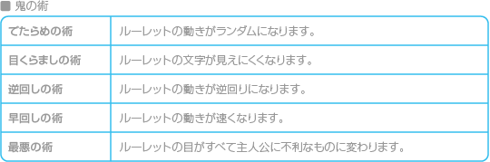 鬼が行動する番になると、攻撃してきたり「術」を使ってきたりします。鬼が攻撃してきた場合は、その結果がルーレットで決まります。ルーレットには「かわす」、「やられる」などの目が表示されるので、 「術」を使ってきた場合はルーレットの動きや表示が変わります。「術」の効果は数ターンが経過すると自動的になくなるほか、戦闘コマンドの「仲間」でまつのすけの能力を使うと一定の確率で消せます。 |