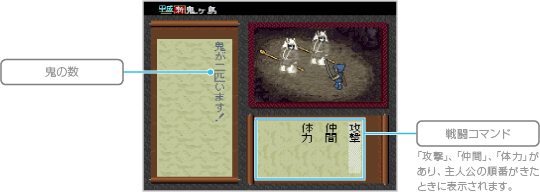 お話の途中で鬼が登場するとコマンドに「戦う」が表示されることがあり、選ぶと戦闘が始まります。戦闘コマンドを選び、鬼を攻撃して倒してください。 |