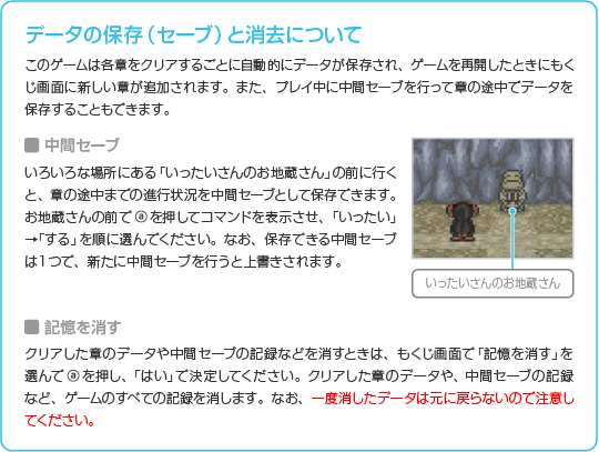 このゲームで遊んだデータがある場合は、もくじ画面に「記憶を消す」と「つづきから」、プレイ可能な章が表示されます。プレイ可能な章を選ぶと、その章の最初からお話が始まります。「つづきから」を選ぶと、中間セーブをしたところからお話を再開できます。