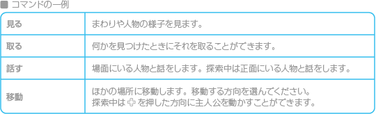 いったいさんのお話が終わると、りんごやまつのすけの冒険が始まります。さまざまなコマンドを選んで主人公の行動を決め、お話を進めてください。 ![]() ![]() ※このほかにも、場面によってさまざまなコマンドが表示されます。 |