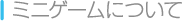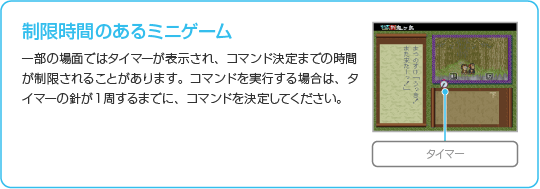 ゲームを進めていくと、ミニゲームをクリアしてお話を進める場面になることがあります。ミニゲームにはアクションゲームや謎解きゲームなどがあり、それぞれ操作方法が異なります。画面に表示される操作方法やルールを確認して、挑戦してください。 ![]() |