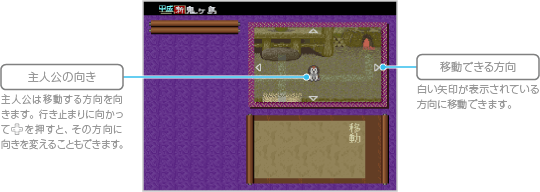一部の場面では、主人公を動かし場面内を自由に探索できます。場面に白い矢印が表示されたら、 また、 ![]() |