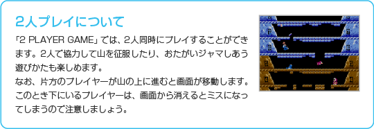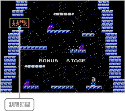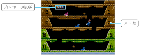 ハンマーで上段のブロックを崩し、ジャンプして山の頂上をめざしましょう。8つめのフロアまで登るとその山を征服したことになります。 なお、敵やつららに触れたり、画面の外に落ちてしまうとミスとなって残り数が減り、残り数が0のときにミスをするとゲームオーバーです。 |