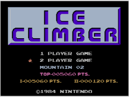 Wii本体の電源を入れたら、Wiiメニュー画面で『アイスクライマー』のチャンネルを選びましょう。タイトル画面が表示されます。 |