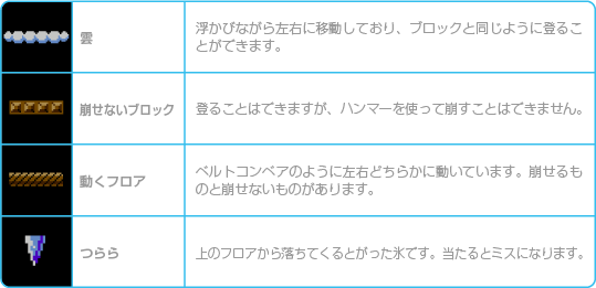 上のフロアに進むときにブロックのすきまが小さいと、ジャンプして上がるのが難しくなります。ただし、ハンマーでブロックを壊してすきまを広げすぎると、今度は登ったときにそのフロアで動きにくくなってしまいます。ブロックの壊しすぎにはくれぐれも注意しましょう。