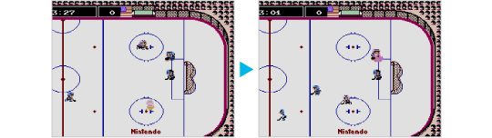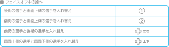 各ピリオド開始時や、得点が入った直後には、両チームから1名ずつ出てパックを取り合う「フェイスオフ」を行います。フェイスオフの開始前には、以下の操作で各選手の位置を入れ替えて、陣形を変えることができます。 |