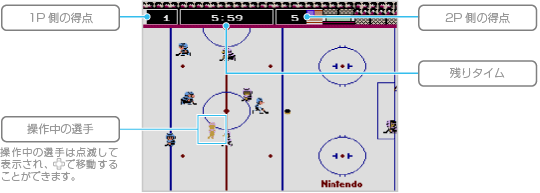 試合開始時は1Pのゴールが画面左、コンピュータ(または2P)のゴールが画面右となります。 ※試合画面で ![]() |