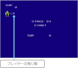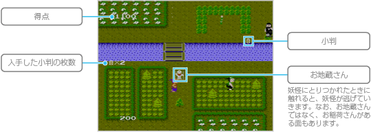 権べと田吾の目的は、小判を集めて代官屋敷をめざすことです。代官の手下である忍者たちをよけたり倒したりしながら、各面に落ちているすべての小判(8枚)を集めましょう。小判を8枚取るか代官をつかまえると、面クリアとなります。 敵や敵の攻撃に当たると「プレイヤーの残り数」が1つ減り、0になるとゲームオーバーです。 |