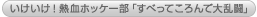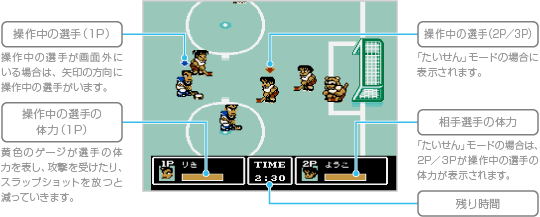 「しなりお [1P]」と「たいせん [2P]」の場合は、操作中の選手を動かすとゴールキーパーも同時に動きます。画面にゴールキーパーが表示されたら、状況に合わせてゴールキーパーを動かして、相手のショットを防いでください。 「しなりお [2P]」の場合は2Pがゴールキーパーを操作し、「たいせん [4P]」の場合は2Pと4Pがゴールキーパーを操作します。 |