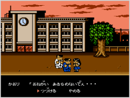 「しなりお」モードの場合は、試合に負けると右のような画面が表示されます。もう一度試合に挑む場合は「つづける」を、タイトル画面に戻る場合は「やめる」を選んでください。なお、「やめる」を選んだ場合はパスワードが表示されます。 |