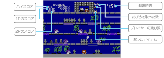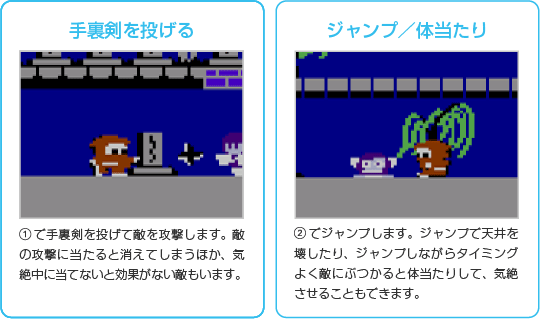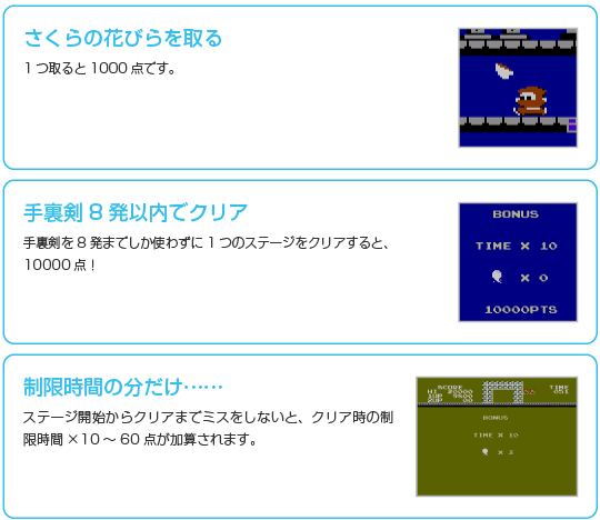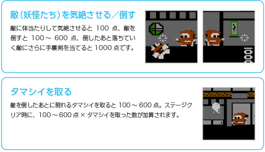 敵を気絶させたり倒したり、コバンを取ったりするとスコアがたまり、20000点や50000点になるとプレイヤーの残り数が1つ増えます。 ![]() |