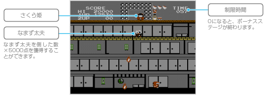 ボーナスステージに進みます。炎などの攻撃をよけながら制限時間内に