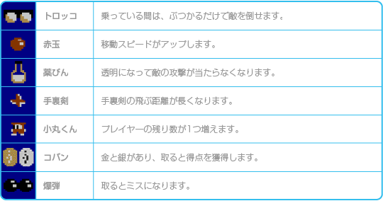 アイテムのトロッコ・赤玉・薬ビン・手裏剣のうちの3種類を取るか、プレイヤーの残り数が4つになると、"忍法ガマパックン"を使ってカエルの「パックン」の上に乗ることができます。