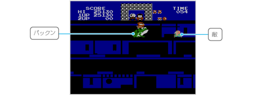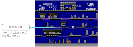 天井をジャンプで壊すとアイテムが現れることがあり、取るとさまざまな効果があります。うまく利用して、ステージクリアをめざしてください。