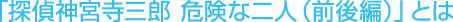 | 『探偵神宮寺三郎 危険な二人(前後編)』は、私立探偵である神宮寺三郎が活躍する推理アドベンチャーゲームです。このゲームは前後編に分かれており、前編が1988年12月9日に、後編が1989年2月10日に発売されました。 | ![]() |