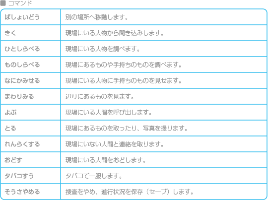捜査はコマンドを使って行います。「ばしょいどう」「きく」といったコマンドを中心に使って、捜査を進めてください。
