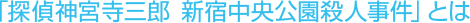 『探偵神宮寺三郎 新宿中央公園殺人事件』は1987年4月24日に発売された推理アドベンチャーゲームです。新宿に事務所を構える私立探偵・神宮寺三郎となり、助手の御苑洋子と共に事件の真相を探っていきます。 |