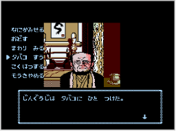 神宮寺の行動は13のコマンドから選びます。捜査の基本である「ききこみ」や「そうさにいく」のほかにも、「タバコ すう」などヘビースモーカーの神宮寺らしいちょっと変わったコマンドもあります。状況に応じてコマンドを選び、事件を解決してください。 |