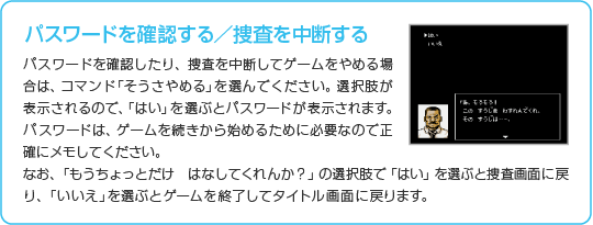 コマンド「そうさやめる」で表示されたパスワード(4ケタの数字)を正しく入力すると、ゲームを続きから始めることができます。 ※パスワードが間違っていた場合は、「0000」と表示された状態に戻ります。 |