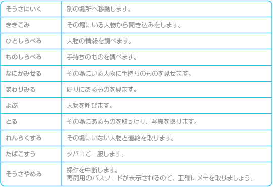 でキャンセルできます。「そうさにいく」「ききこみ」といったコマンドを中心に使って、捜査を進めましょう。