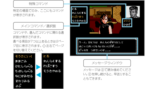 ゲーム中に登場するおもなコマンドは以下のとおりです。なお、メインコマンドと同時に特殊コマンドが現れる場合があり、