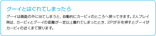 1人プレイ時はコンピュータが自動的にグーイを操作しますが、2人プレイ時は2Pがカービィと同じように操作できます。グーイは敵の能力をコピーしたり、仲間と合体したりできますが、以下のようにカービィと異なる点もあります。 ![]() |