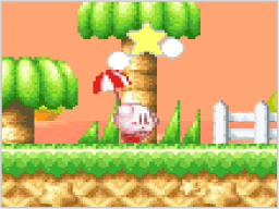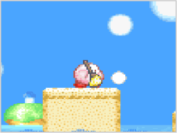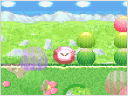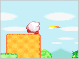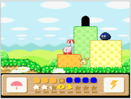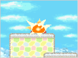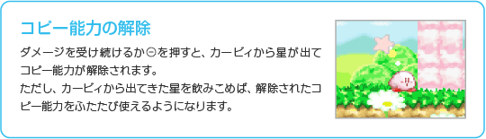 カービィは特定の敵を飲みこむことで、相手の能力をコピーできます。コピー能力は「バーニング」「ストーン」など、全部で8種類あります。 |