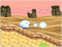 冷たい空気を出して敵を凍らせます。凍らせた敵に体当たりすると、前方に飛ばすことができます。 |