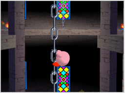 くさりやはしごなど、カービィがのぼりおりできるものは、近づくと自動的につかみます。つかまった状態で